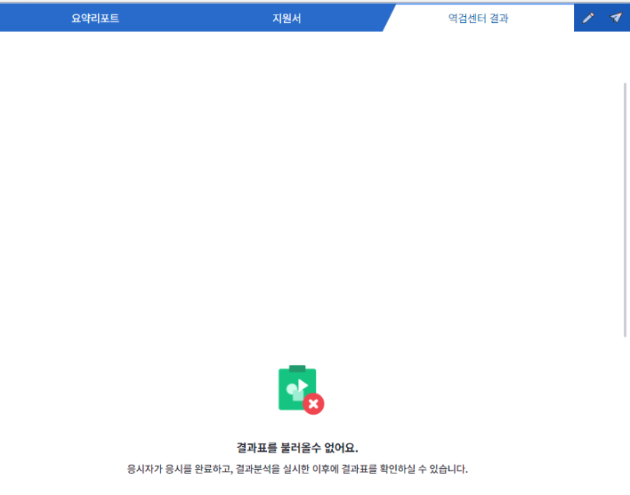 위치: 지원서 탭 > '역검센터 결과' 클릭 > '결과표를 불러올 수 없어요' 화면 뜸