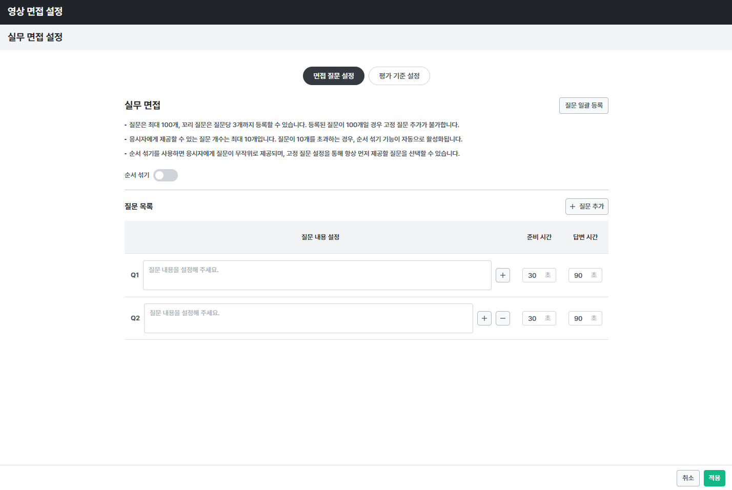 - ‘순서 섞기’ 기능을 사용하거나 문제 은행 질문을 포함한 경우, 실제 면접에서는 질문 순서나 내용이 달라질 수 있습니다.