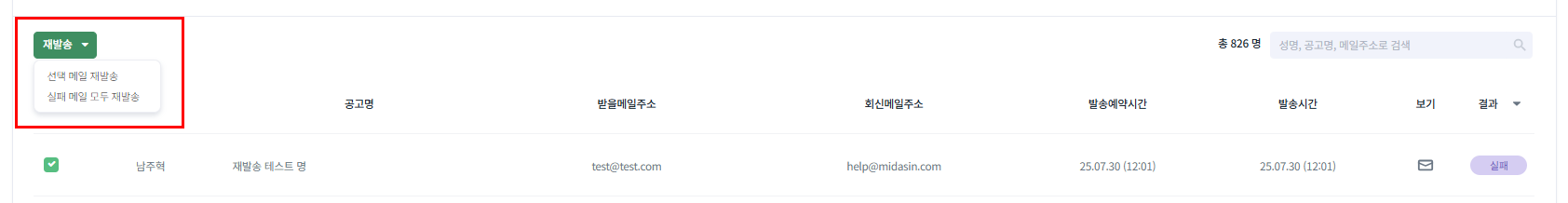 - 메일 혹은 SMS 재발송하려는 경우, 해당 항목을 선택한 후 상단 재발송 버튼을 클릭하시어 진행하실 수 있습니다.