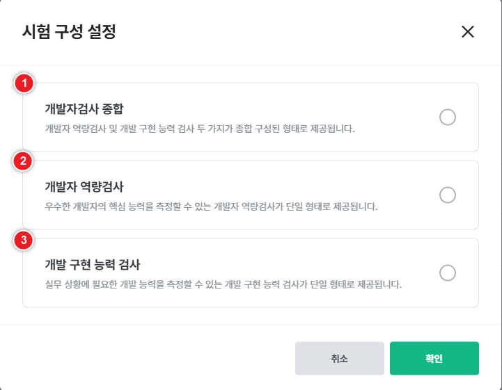 - 개발자 역량검사 or 개발 구현 능력 검사 중 하나를 선택하거나, 두 가지 검사를 모두 선택해 구성할 수 있습니다.