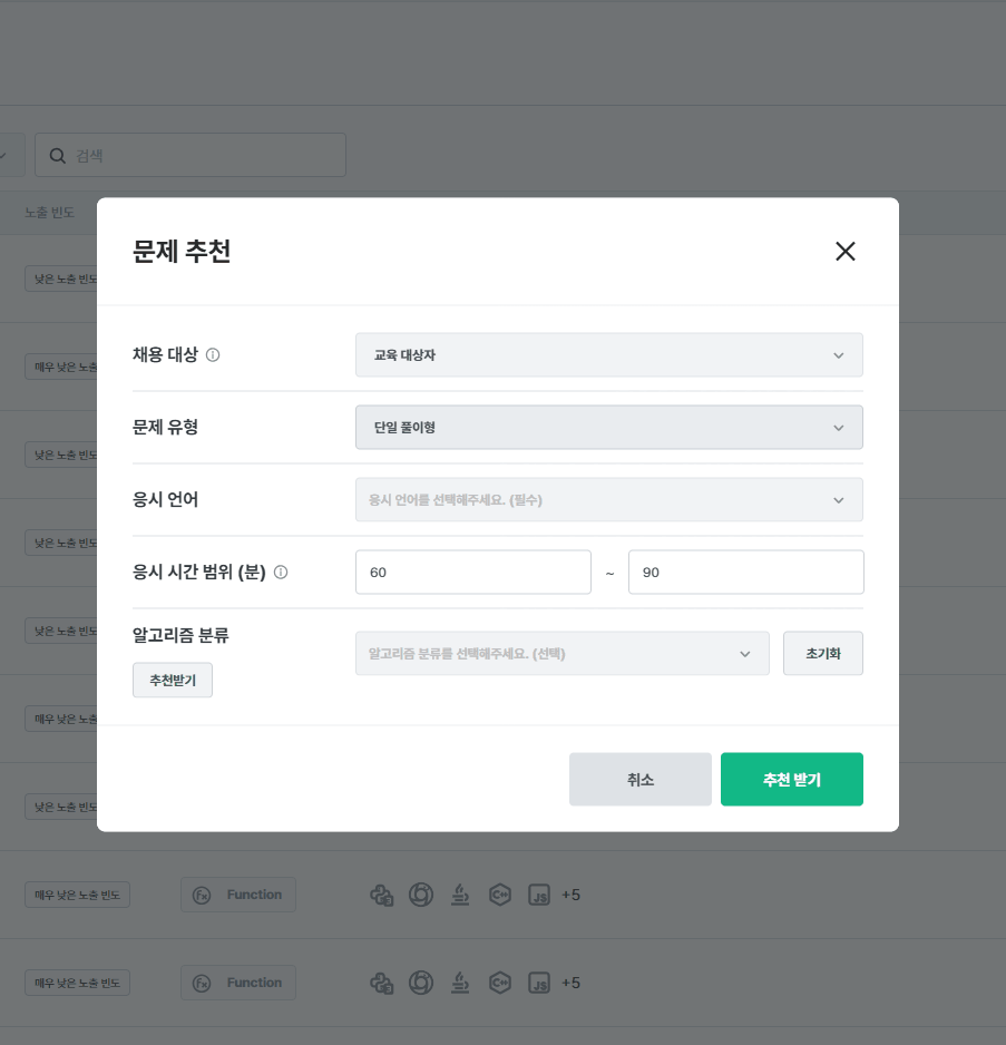 - 선택한 필터 조건(채용 대상, 알고리즘 분류 등)에 따라 적합한 문제를 추천해줍니다.