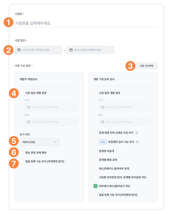 - 2번에서 설정한 시험 일정 기간 내에서 개발자 역량검사에 응시 가능한 일정을 개별적으로 설정할 수 있습니다.