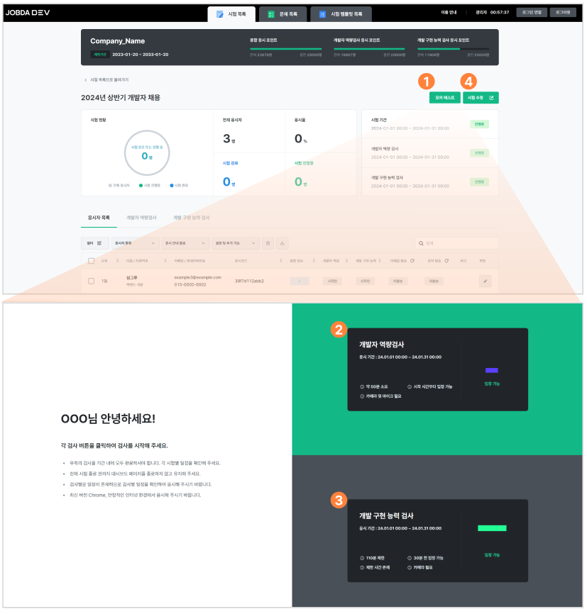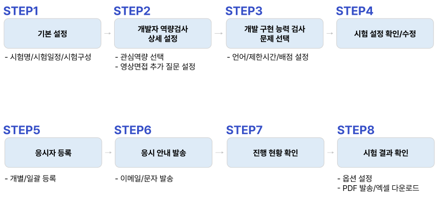 시험을 통해 개발자 특화 역량(개발자 역량검사)과 실무 개발 능력(개발 구현 능력 검사)을 측정하도록 설정합니다.