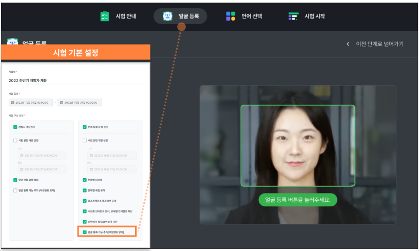 - 부정 행위 방지를 위해 응시 시작 전, 응시자의 얼굴을 등록하는 절차를 추가합니다.