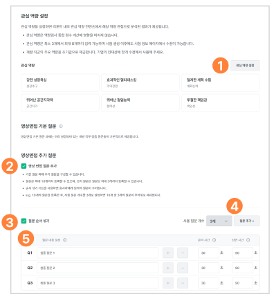 - 이전 단계에서 ‘영상 면접 과제 제외’에 체크했다면, 영상면접 추가질문과 관련된 설정은 나타나지 않습니다.