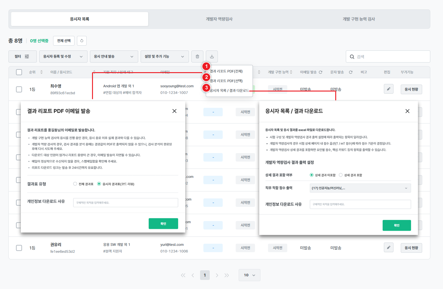 - 응시자의 결과 리포트를 PDF로 다운로드할 수 있습니다.