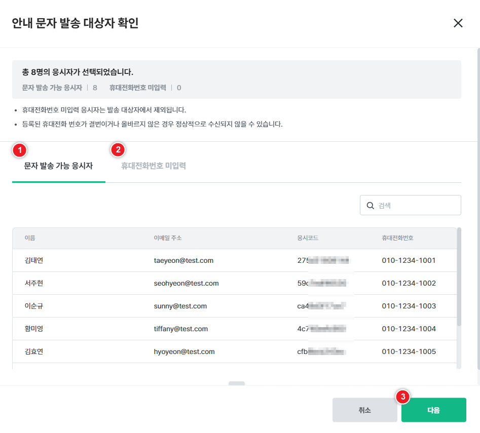 문자를 발송하기 전, 문자를 발송할 수 있는 응시자와 발송할 수 없는 응시자를 확인합니다.