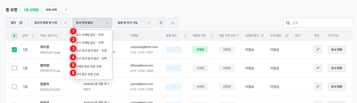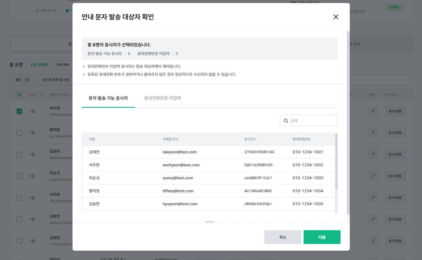 - 이 명단에 포함된 응시자에게만 실제로 문자 발송이 가능합니다.