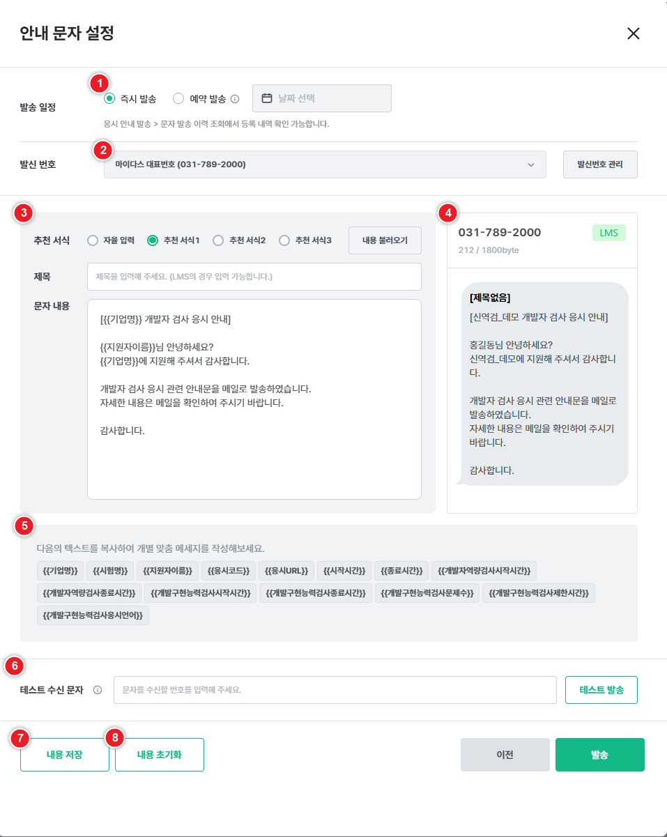 - 응시자에게 실제 문자를 보내기 전, 내용을 미리 테스트용으로 확인할 수 있습니다.