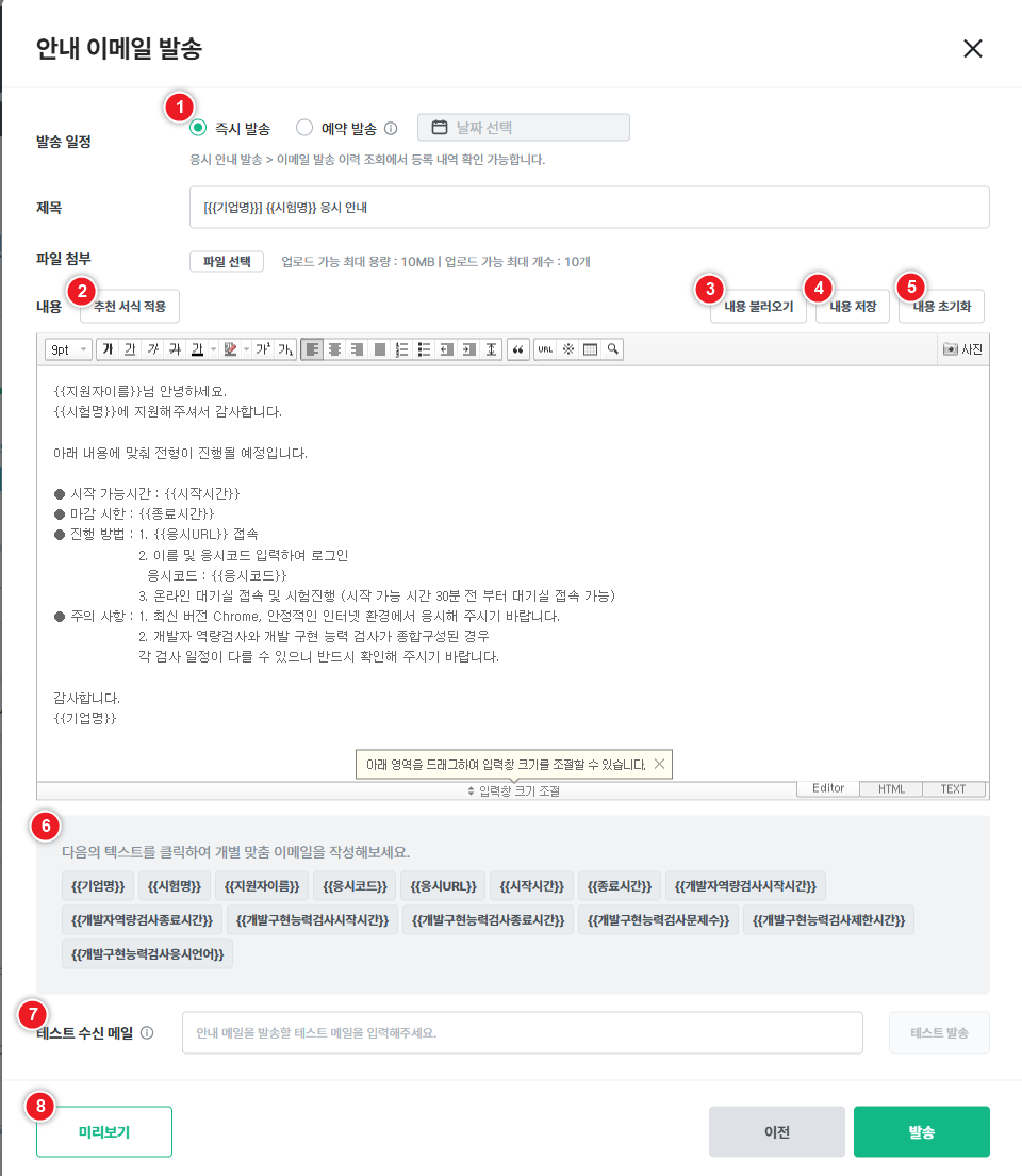 - 테스트 메일은 한 번에 하나씩만 발송할 수 있습니다.