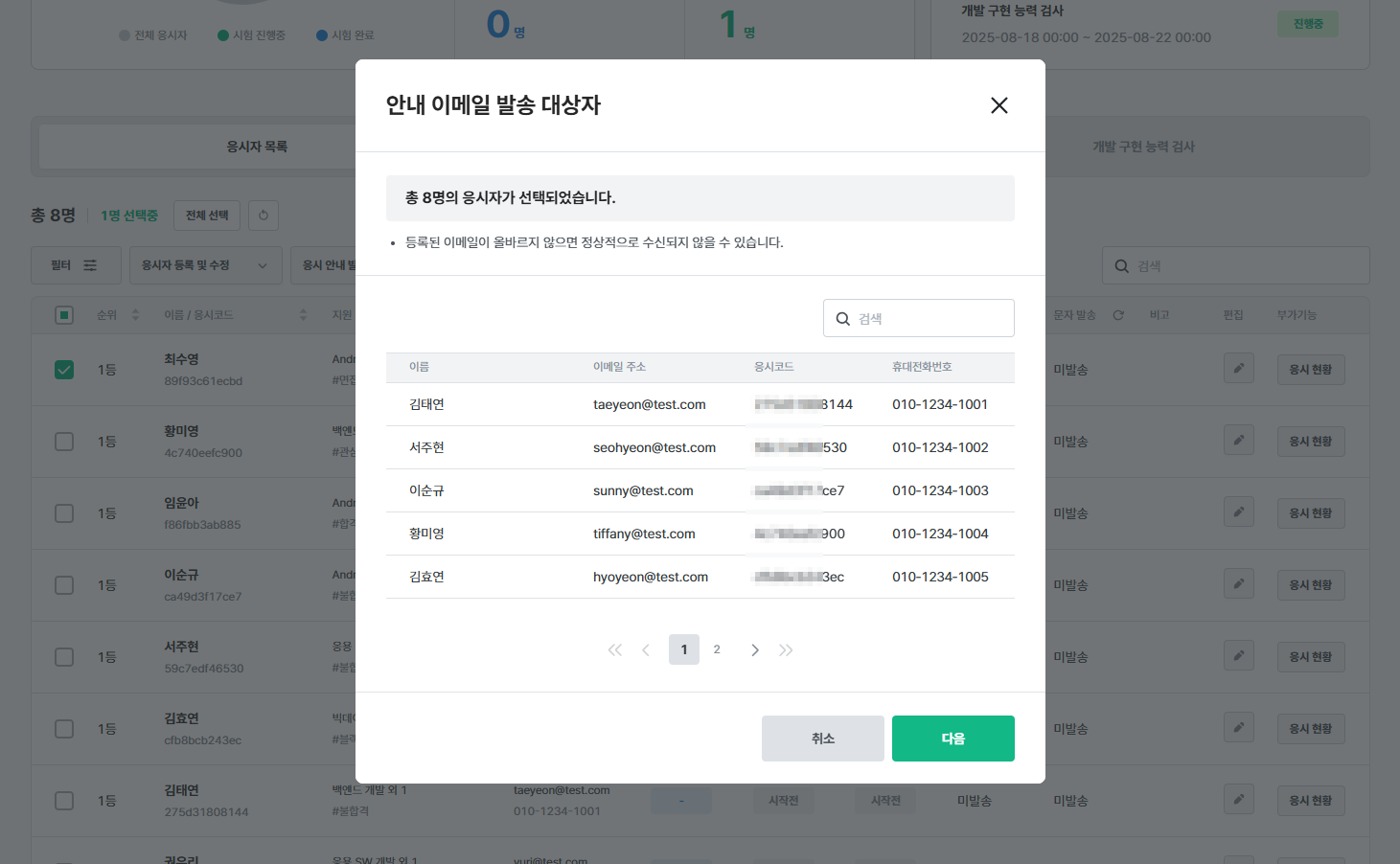 - 시험에 등록된 일부 응시자에게 응시 안내 이메일을 발송합니다. 아래 목록에서 메일을 받을 응시자를 먼저 선택해야 합니다.