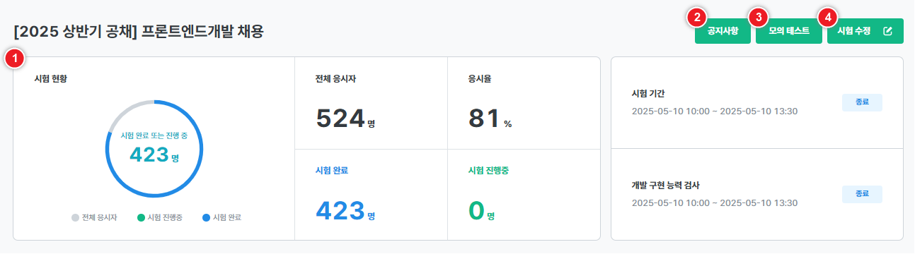 - 개발자 역량검사의 진행 현황 및 등급 분포를 실시간으로 확인할 수 있습니다.