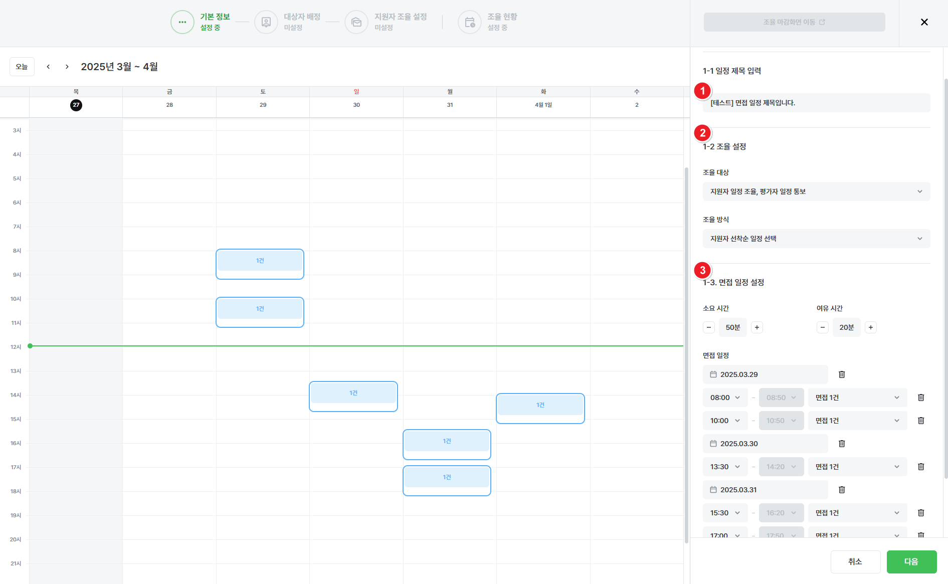 ✔️ 최초 일정은 캘린더에서 클릭하여 생성하고, 우측 메뉴에서 해당 시간에 대한 면접 건수를 설정합니다.