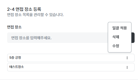 일괄 적용 : 등록된 면접 장소의 ‘더보기’ 메뉴에서 ‘일괄 적용’을 선택하면, 현재 그리드에 입력된 모든 일정에 동일한 면접 장소가 적용됩니다.