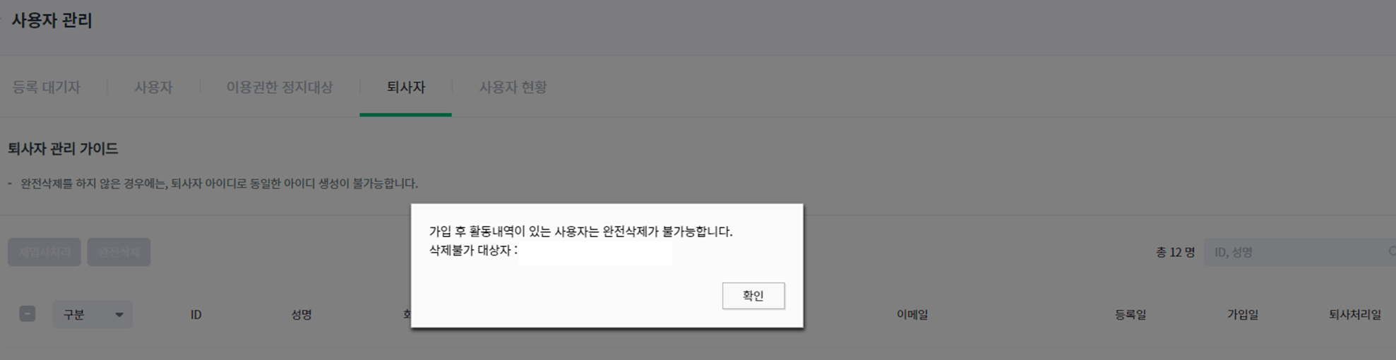 단, 평가 이력이 존재하는 계정의 경우 완전 삭제가 불가능합니다.