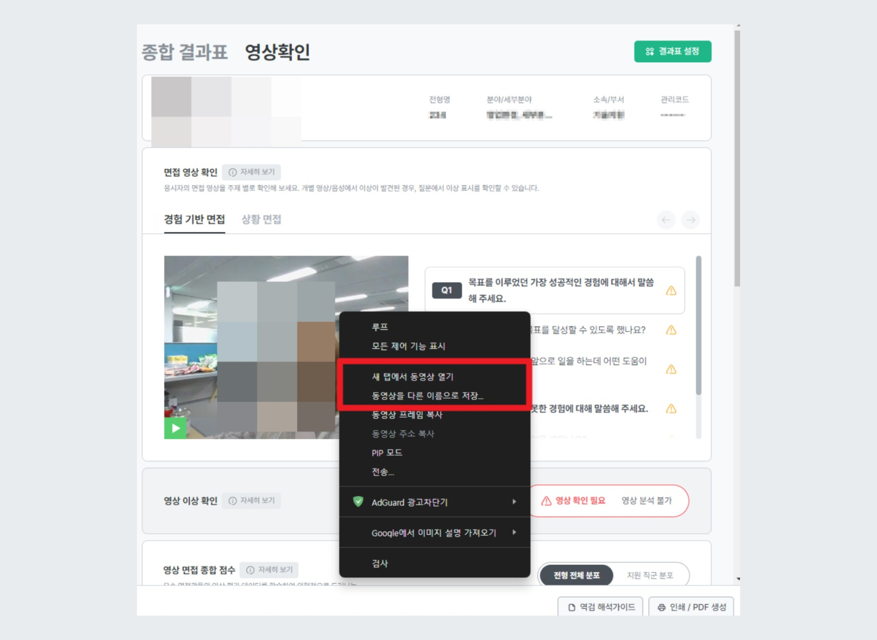 솔루션 상에서 제공하는 기능은 없지만 동영상에 오른쪽 마우스를 클릭하신 후 다른 이름으로 저장하기를 통해 영상면접을 저장하실 수 있습니다.